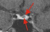 MRI FINDINGS: Fig. 1 is a precontrast coronal image through the sella. Fig. 2 is an image from the first postcontrast dynamic scan. Fig. 3a-b are delayed coronal and sagittal scans. A 6 mm microadenoma is clearly visible in Fig. 2 in the left aspect of the gland (red arrows). This is due to the fact that normal pituitary tissue (owing to lack of blood brain barrier) rapidly enhances before a microadenoma demonstrates enhancement. Note that this same lesion is less conspicuous on the delayed scans (Fig. 3a-b). In some cases, delayed scans completely obscure a microadenoma due to the fact that the microadenoma gradually enhances as time goes by. Routine MRI of the sella utilizes scans that are on the order of minutes, allowing a microadenoma to enhance thus reducing tissue contrast between a microadenoma and normal pituitary tissue.