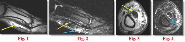 MRI FINDINGS: The MRI was performed on AIC’s high-field 1.5 Tesla short-bore Siemens Symphony. An ultra small, high-resolution digit coil was utilized to evaluate the thumb. A small field of view of only 6 cm was used. Slice thickness of 0.8 mm to 2 mm were selected. Sagittal, axial and coronal 2 mm T1W and fat suppressed T2W Fat Sat and coronal 0.8 mm DESS were obtained. Fig. 1 (Sagittal T1W) shows moderate thickening of the flexor pollicis tendons along the proximal phalanx with some increased signal. Fig. 2 (sagittal T2 Fat Sat) shows the same with subcutaneous edema and small amount of fluid in the tendon sheath. It is difficult to separate the superficial and deep flexor tendons. Fig. 3 and Fig. 4 are the corresponding axial images demonstrating the same findings.