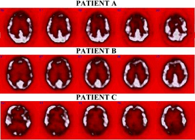 Please call me personally for any questions or concerns.First, this unusual color scale is chosen to accentuate the gray matter. Patient A demonstrates diffuse frontal hypometabolism due to a head injury. In comparison, Patient B demonstrates only mild right frontal hypometabolism, also due to head trauma. Patient C presents with dementia and demonstrates diffuse hypometabolism in the posterior occipito-parietal regions and mild hypometabolism in the temporal and frontal regions.