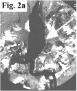 MRA FINDINGS: Fig. 1 on the left is the subtraction CE-MRA. Fig. 2 on the right displays selective x-ray angiogram images performed by Dr. Gadallah. There is a large fusiform aneurysm of the distal aorta and focal aneurysm in the left common femoral artery (white arrows), shown equally well on both MRA and x-ray angio (Fig. 2a). But the interesting finding is in the distal right superficial femoral artery (SFA) where there is 12 cm long segment occlusion seen on MRA (Fig. 1, red arrowheads) with reconstitution at the popliteal artery via collaterals. There is an apparent filling defect (arrows) within the SFA consistent with thrombosis. The surrounding hyperintensity probably represents enhancement in an edematous/inflamed vessel wall. The x-ray angio in Fig. 2b confirms total occlusion of distal SFA (blue arrows).