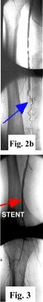 TREATMENT: The patient underwent angioplasty and stent placement by Dr. Gadallah with resultant restoration of brisk flow in the distal right SFA (red arrow in Fig. 3, which is a post-stent image).*