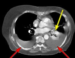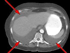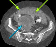 HELICAL CT FINDINGS: The CT was performed on AIC’s multi-slice helical CT (MSCT) scanner. Images with 5 mm collimation were obtained before, immediately following and 5-10 minutes after power injection of IV contrast. Fig. 1 demonstrates large bilateral pleural effusions (red arrows) with secondary compressive atelectasis of the lower lobes (yellow arrow). Fig. 2 shows large amount of ascites (arrows). Fig. 3 shows a large heterogeneous complex pelvic mass (blue arrow) and a large amount of peritoneal masses consistent with omental metastasis known as “omental caking” (green arrows).