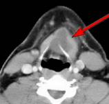 DISCUSSION: A thyroglossal duct cyst is a congenital neck mass or lump that develops from cells and tissues remaining after the formation of the thyroid gland during embryonic development. It is most commonly diagnosed in preschool-aged children or during mid-adolescence, and often appears after an upper respiratory infection when it enlarges and becomes painful. When the thyroid gland forms during embryonic development, it begins at the base of the tongue and moves down the neck through a canal called the thyroglossal duct. This duct normally disappears once the thyroid reaches its final position in the neck. Sometimes, portions of the duct remain leaving cavities or pockets called cysts. These cysts can fill with fluid or mucus, and may enlarge if they become infected. Very enlarged cysts can cause difficulty swallowing or obstruct breathing passages. Symptoms may include: a small, soft, round mass in the center front of the neck; tenderness, redness, and swelling of the mass, if infected; a small opening in the skin near the mass, with drainage of mucus from the cyst; difficulty swallowing or breathing.