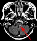 MRI Findings: In the supratentorial regions, some atrophy and chronic small vessel deep white matter ischemic changes were observed (Fig. 1) but no acute lesion or infarct was observed on MR diffusion. In the posterior fossa, however, a subtle small 1 cm hyperintensity can be seen in the left side of medulla on T2 weighted (Fig. 2) and FLAIR images (Fig. 3). This can be seen with an infarct, but its age would remain indeterminate. The MR diffusion image (Fig. 4) shows hyperintensity in the same region consistent with an acute infarct (arrows) as opposed to chronic ischemic changes.